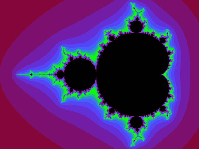 English: Mandelbrot set with colored environment. Each pixel is associated with a certain sequence of complex numbers. The index for which the absolute value of all following numbers exceed 1000 increases from each colored stripe to the next towards the mandelbrot set by the amount of 1. Coordinates of the center: Re(c) = -.7, Im(c) = 0 Horizontal diameter of the image: 3.1