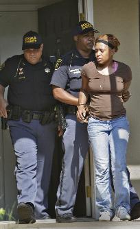 Left: Danelle Swanson is arrested by DeKalb County Sheriff's deputies N. Mendez (left) and D. Dickerson at her apartment in DeKalb County during a roundup of parents of truant children.